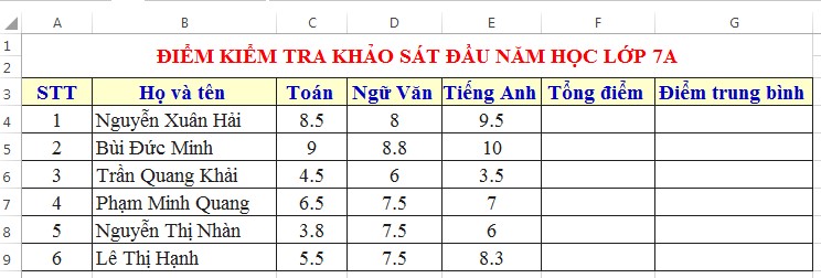 a) Viết ra hàm em sẽ nhập vào ô G4 để tính điểm trung bình của bạn Hải. b) Trình bày cách sao chép công thức tại ô G4 để tính điểm trung bình cho các bạn còn lại?